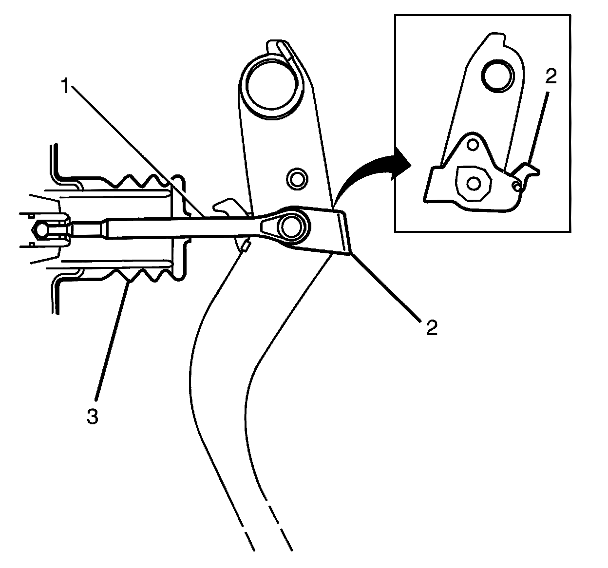 3. Reposition the pedal pushrod boot (3) toward the front of the vehicle to expose as much of the pedal pushrod (1) as possible.