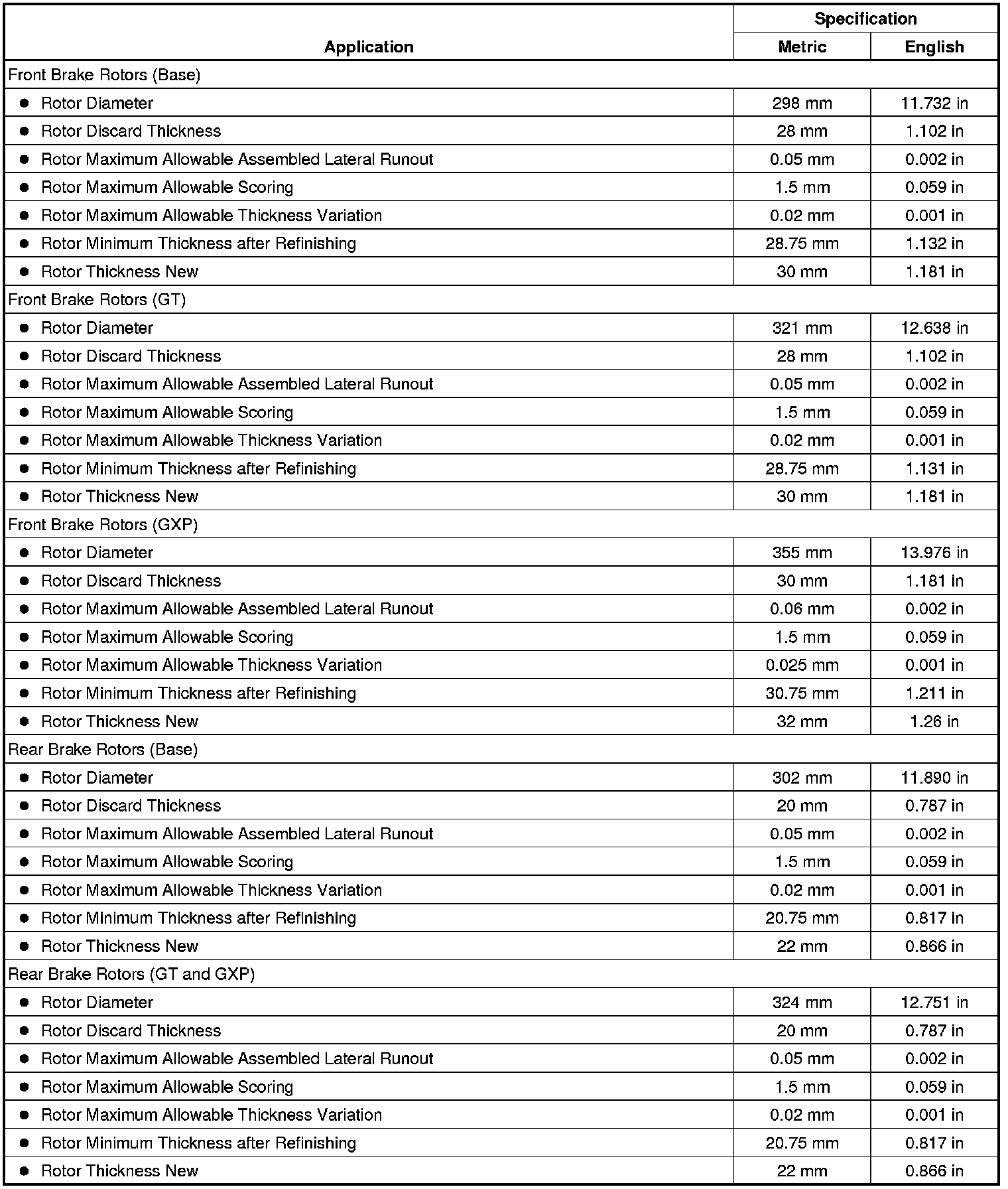 Disc Brake Component Specifications