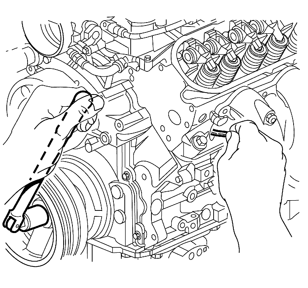1. Remove the valve rocker arm covers. Refer to Valve Rocker Arm Cover Replacement - Left Side (Valve Rocker Arm Cover Replacement - Left Side) or Valve Rocker Arm Cover Replacement - Right Side (Valve Rocker Arm Cover Replacement - Right Side).