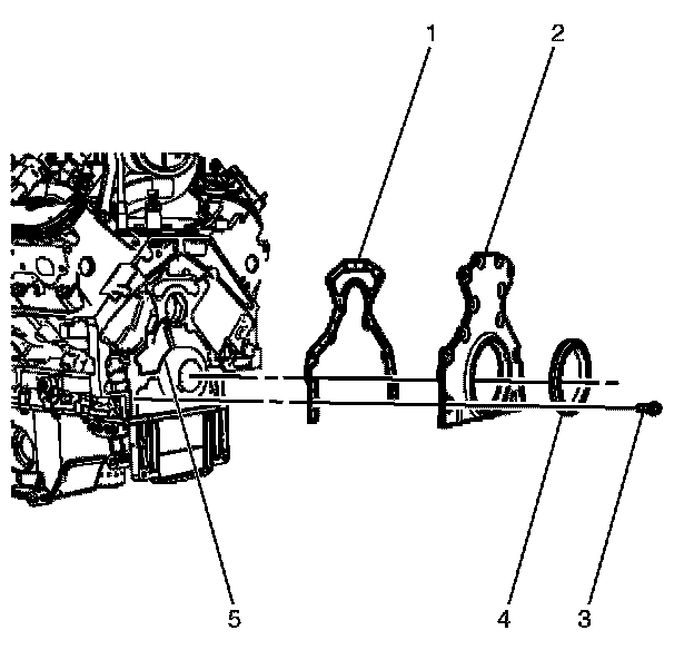 3. Install the new rear oil seal housing gasket (1) to the engine block (5).