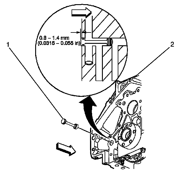 1. Inspect the rear oil gallery plug (1) for correct installation to the engine block (2).