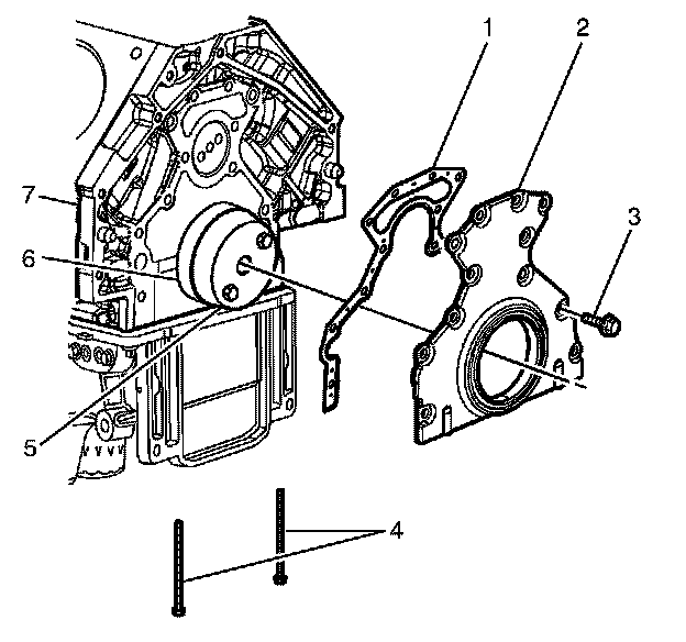 4. Install the new rear oil seal housing gasket (1) to the engine block (7).
