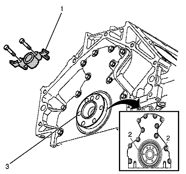 6. Install the rear oil seal housing to engine block bolts (3). Finger tighten only at this stage.