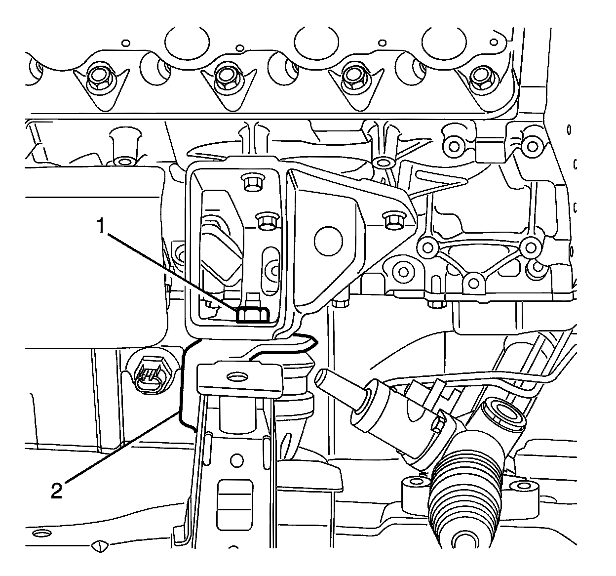 2. Lower the engine assembly until the right side engine mount retaining stud (2) is installed through the right side engine mount bracket (1).
