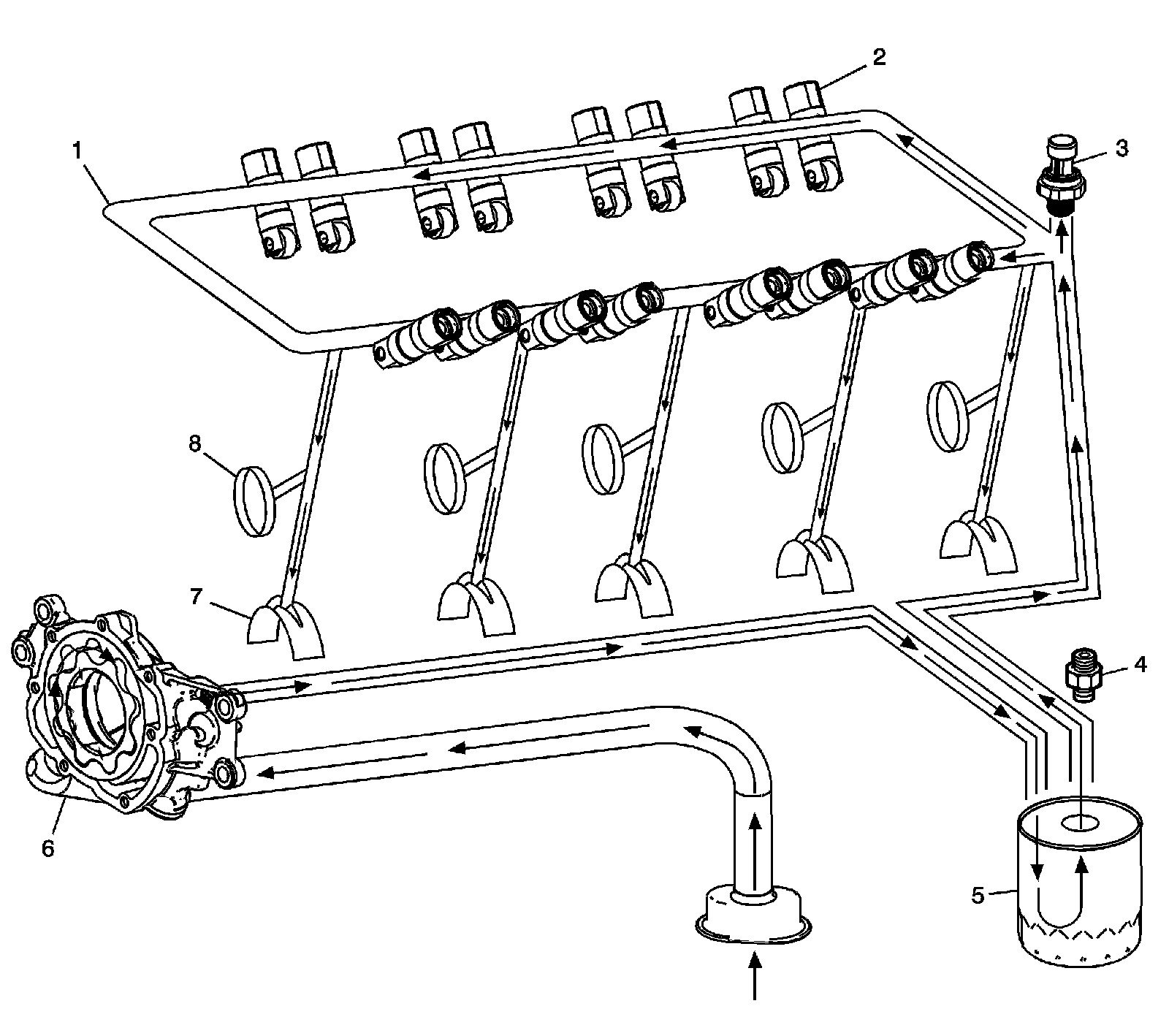 Oil is then directed from the filter to the upper main oil galleries (1). Oil from the left upper oil gallery is directed to the crankshaft bearings (7) and camshaft bearings (8). Oil that has entered both the upper main oil galleries also pressurizes the valve lifter assemblies (2) and is then pumped through the pushrods to lubricate the valve rocker arms and valve stems. Oil returning to the pan is directed by the crankshaft oil deflector. The oil pressure sensor (3) is located at the top rear of the engine.