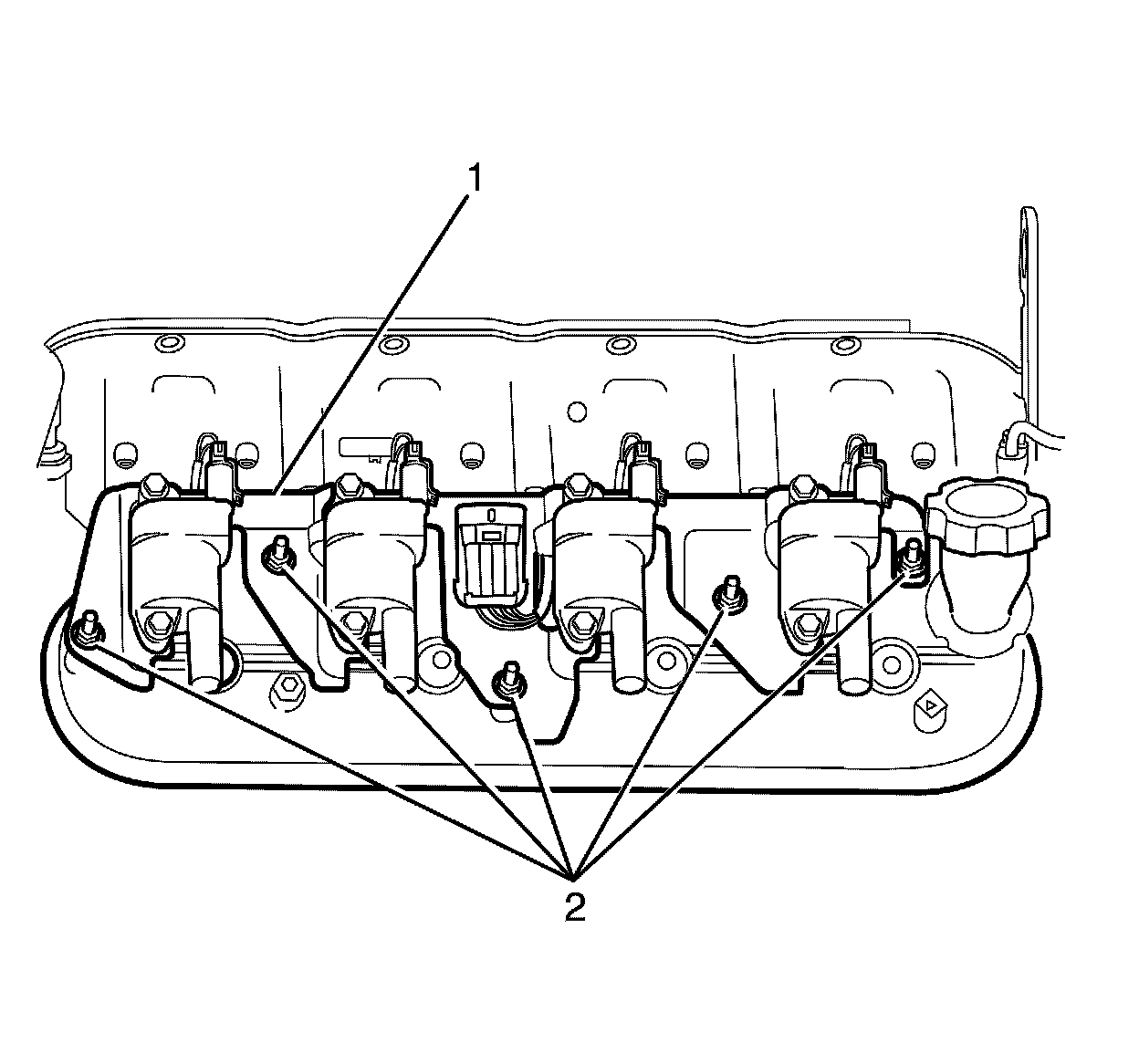4. Remove the valve rocker arm cover retaining bolts (2) and valve rocker arm cover (1).