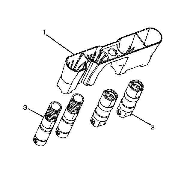 3. Remove the valve lifters (2 and 3) from the valve lifter guide (1).