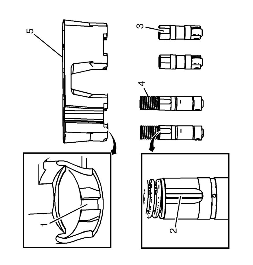 Important: The cylinder deactivation lifters (4) are installed into the guide (5) by aligning the notched area of the guide (1) with the raised surface on the side of the lifter (2).