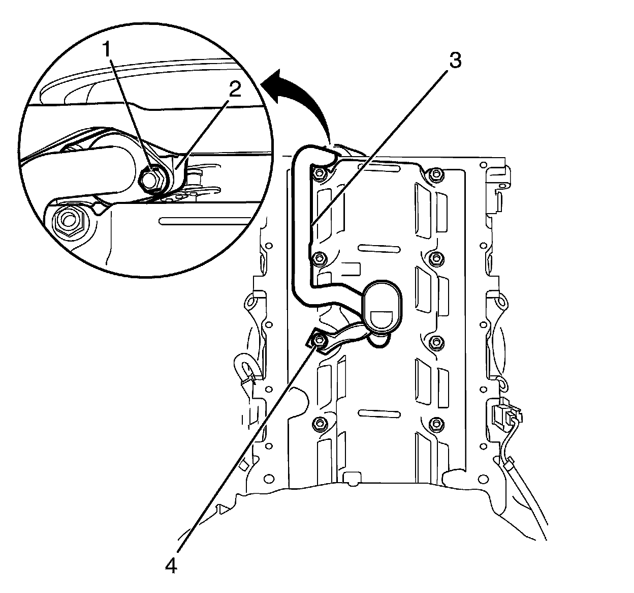 2. Remove the oil pump screen and tube assembly to crankshaft oil deflector retaining nut (4).