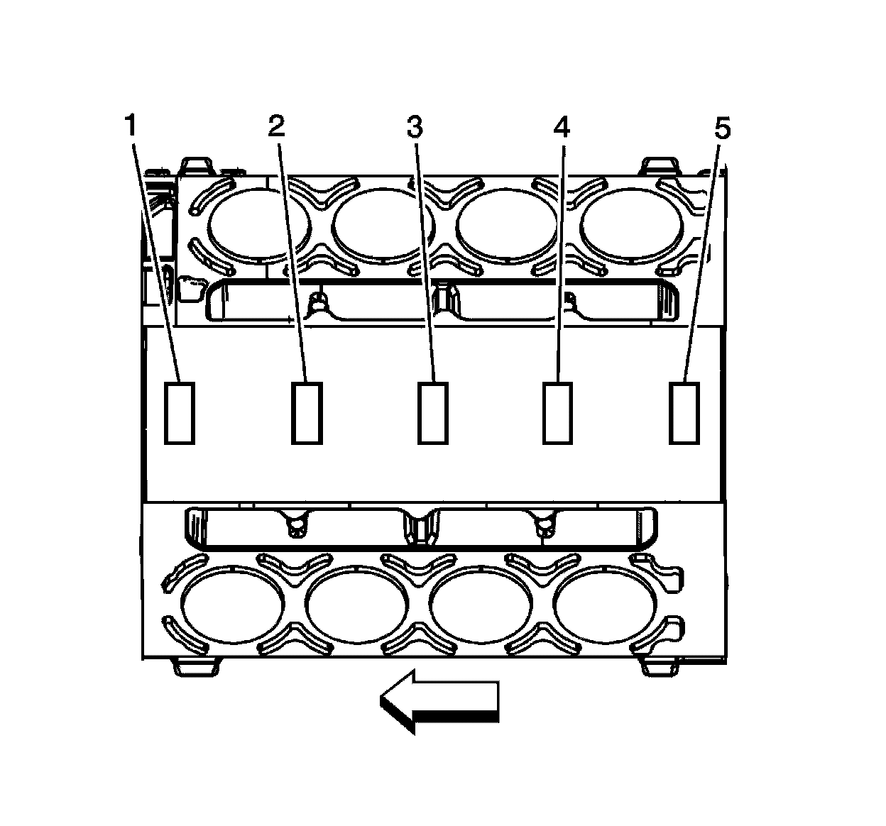 1. Measure the engine block camshaft bearing bores (1-5) in order to identify the correct OD size bearing for each position. Refer to Engine Mechanical Specifications (6.2L LS3) (Specifications)Engine Mechanical Specifications (L76) (Specifications).