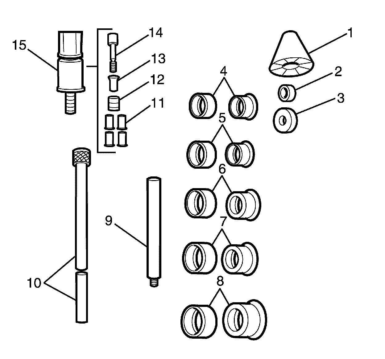2. Select the expanding driver (4 - 8) and washer (2 or 3) from the J 33049 .