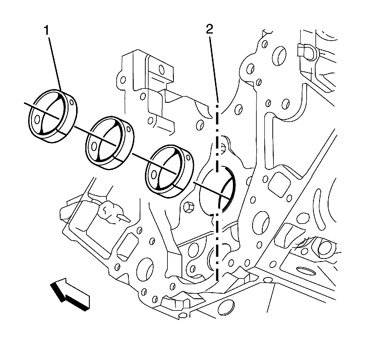 4. Align the new camshaft bearing (1) with the top of the cylinder block centerline (2).