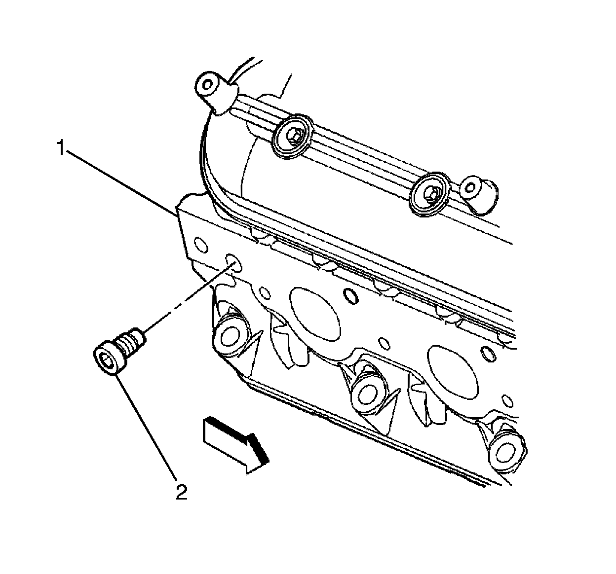 12. Remove the coolant plug (2) from the right cylinder head (1).