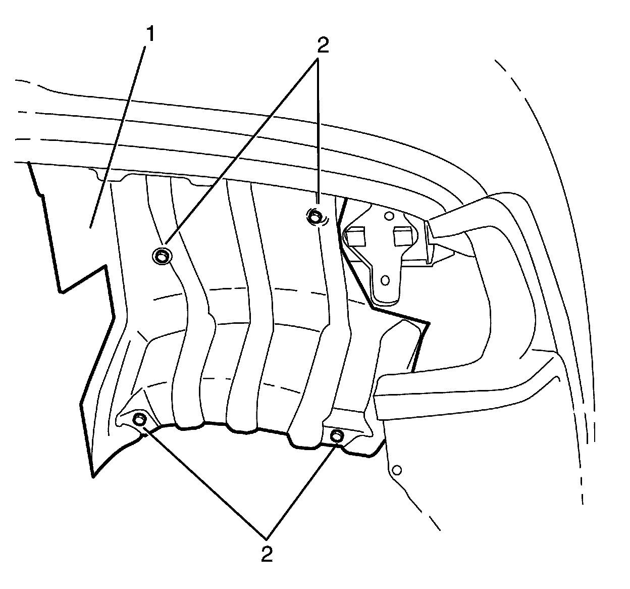 2. Install the left exhaust muffler heat shield to body retaining bolts (2) and tighten to 4 Nm (35 lb in).