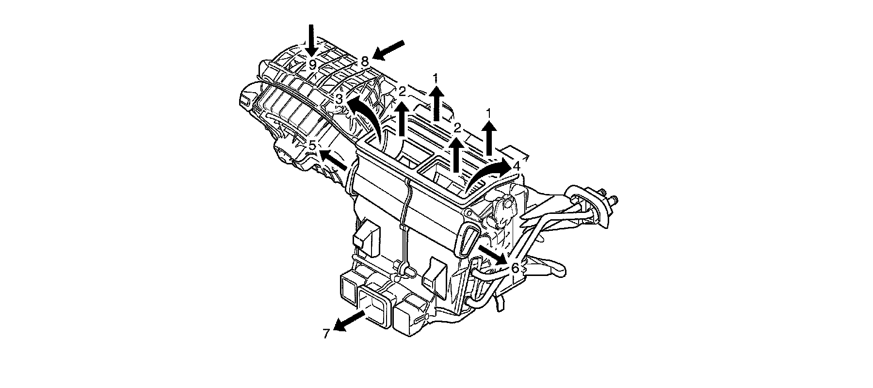 The A/C switch is on (1) or the auto button is pressed. The fan switch is set to any one of twenty speeds (2). The temperature switch is set to the full cold position (3). The mode control switch is set to floor mode (4). The recirculation door (7) is closed allowing outside (6) air to enter and flow into the HVAC module assembly via the plenum chamber inlet (7). Air is drawn into the HVAC module assembly by the blower motor (8), and is then forced through the cold evaporator fins (9). In full cold mode, the air mix doors (10) are fully closed sealing off the passage through the heater core (11). The air travels through the face/floor door (12), which is fully open in the floor mode. The cold air (13) is then directed to floor ducts.
