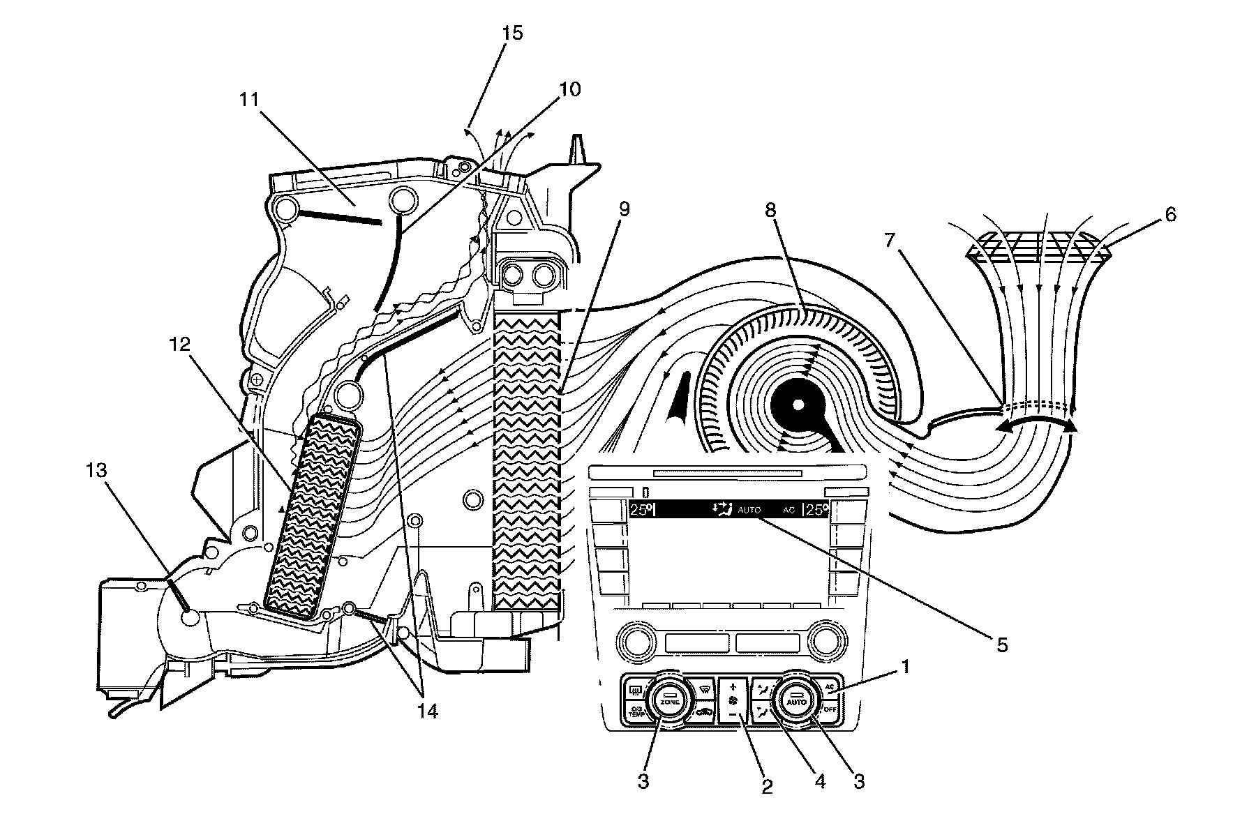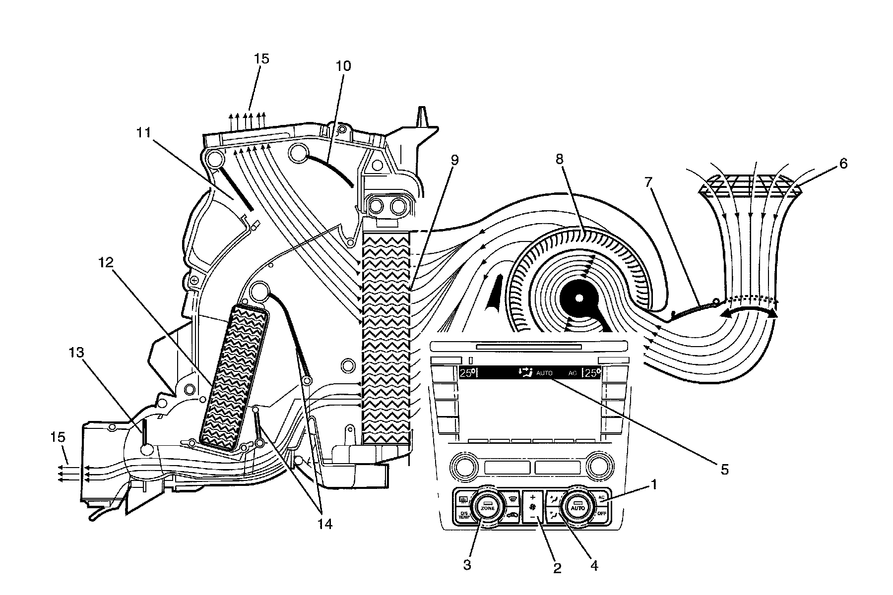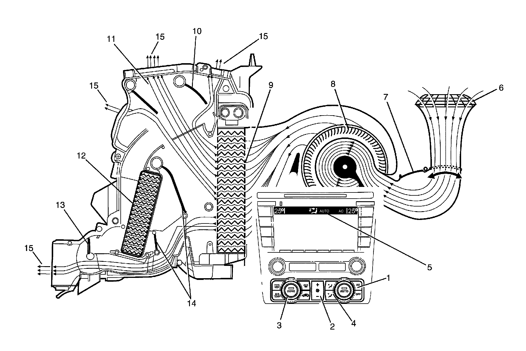 The A/C switch is on (1) or auto button is pressed. The fan switch is set to any one of twenty speeds (2). The temperature is set to the full cold position (3). The mode control switch is set to face mode (4). The recirculation door (7) is closed allowing outside air (6) to enter and flow into the HVAC module assembly via the plenum chamber inlet. Air is drawn into the HVAC module assembly by the blower motor (8), and is then forced through the cold evaporator fins (9). In full cold mode, the air mix doors (14) are fully closed sealing off the passage through the heater core (12). The air travels through the open face door (11). The cold air (15) is then directed through the centre and side vents.