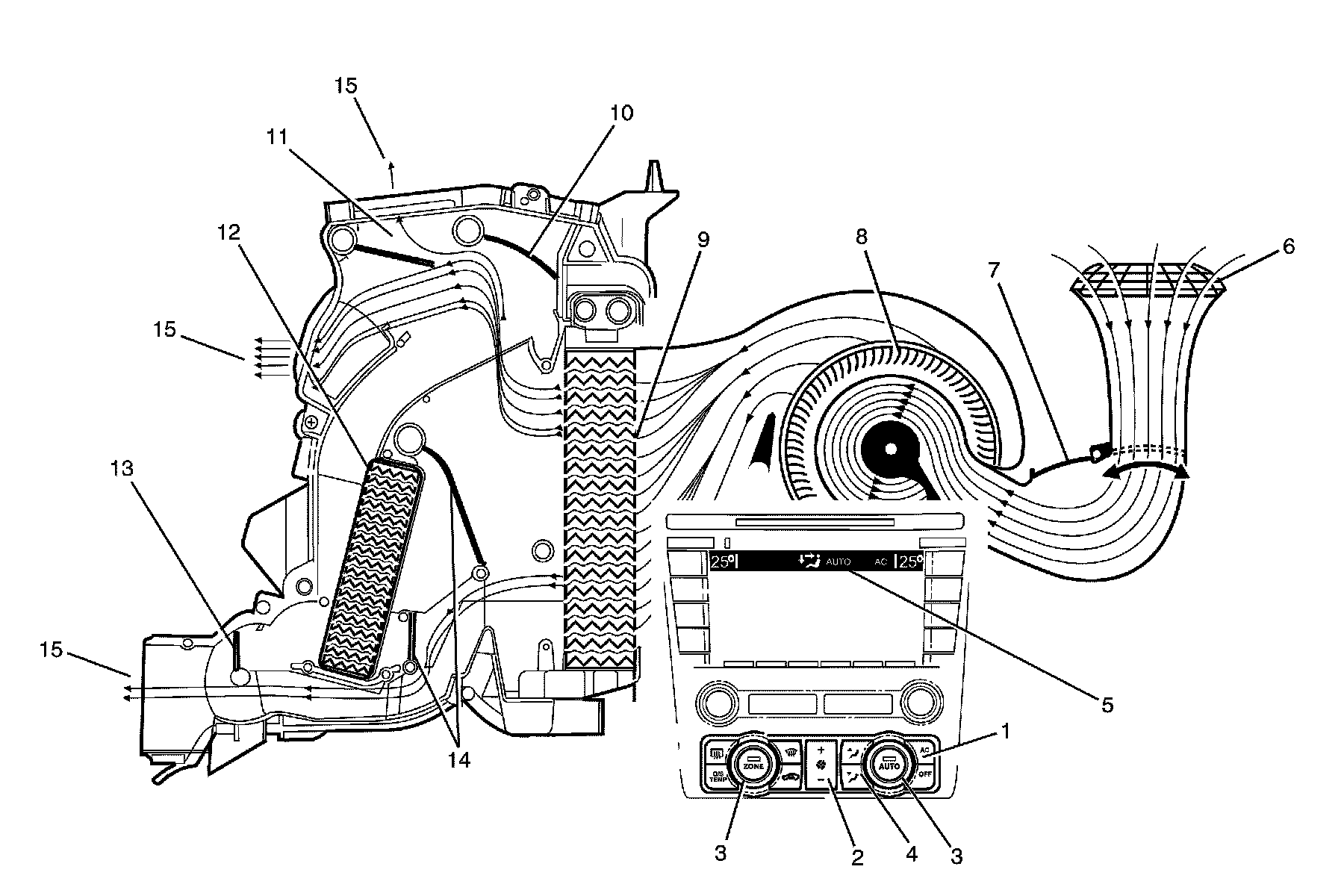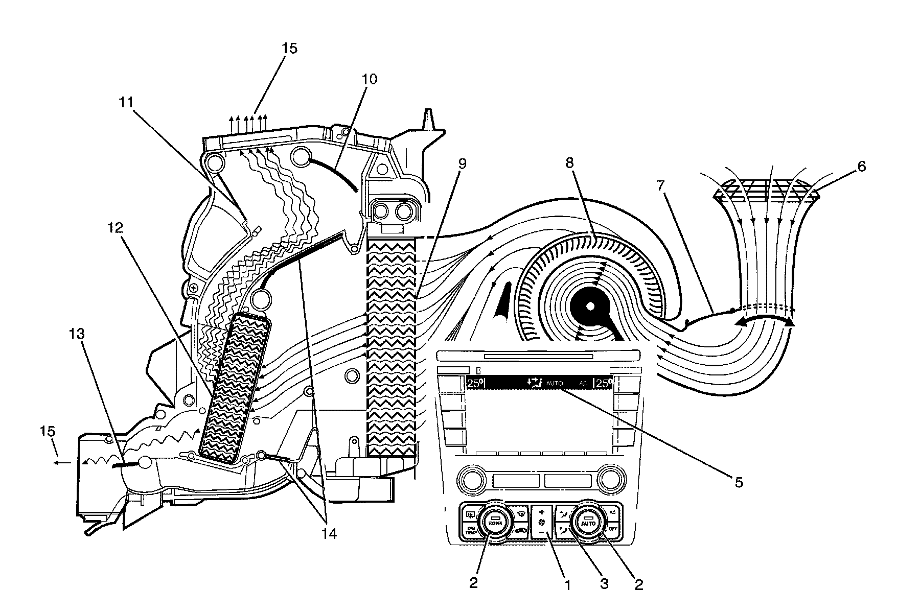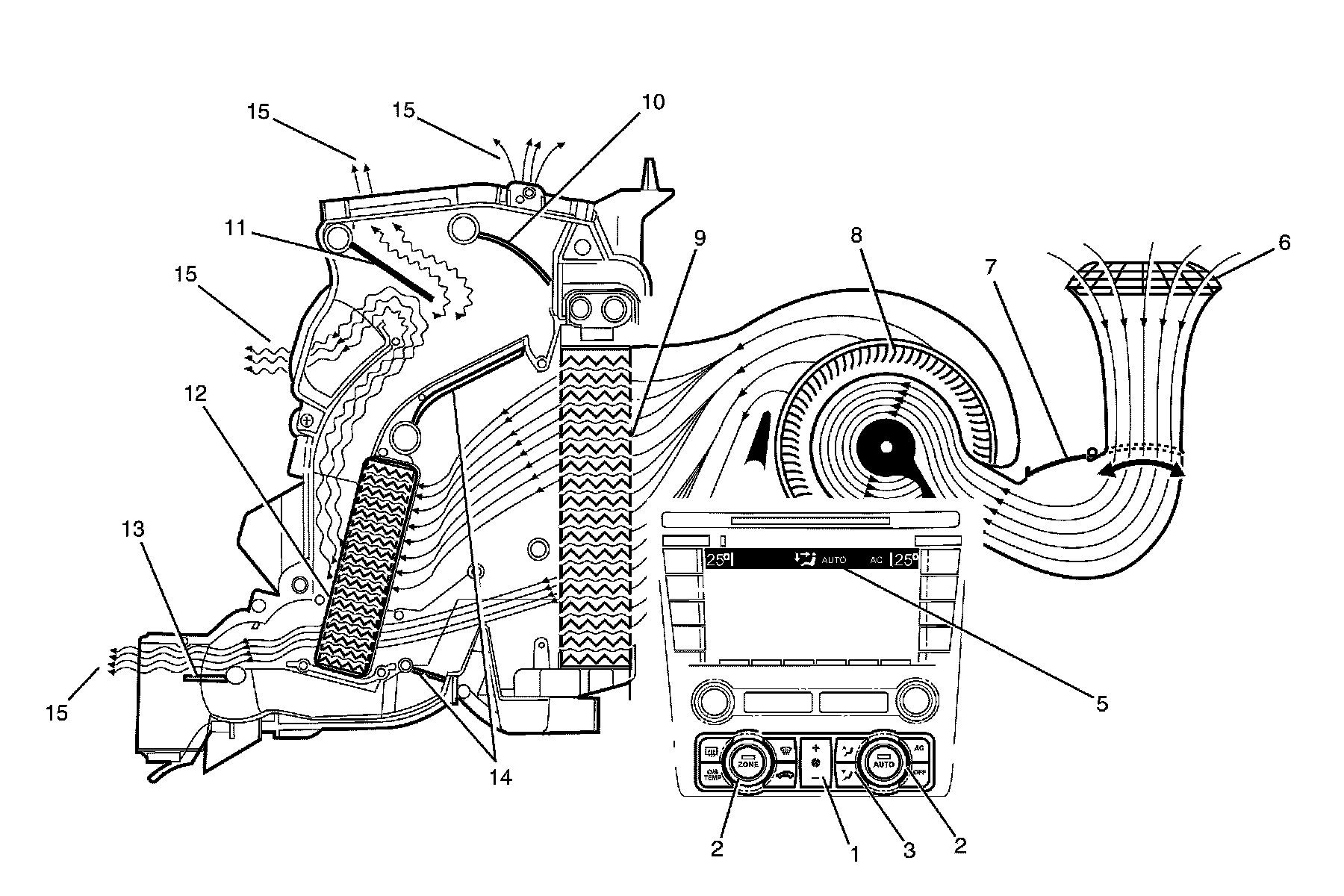 The A/C switch is on (1) or auto button is pressed. The fan switch is set to any one of twenty speeds (2). The temperature is set to the full cold position (3). The mode control switch is set to face mode (4). The recirculation door (7) is closed allowing outside air (6) to enter and flow into the HVAC module assembly via the plenum chamber inlet. Air is drawn into the HVAC module assembly by the blower motor (8), and is then forced through the cold evaporator fins (9). In full cold mode, the air mix doors (14) are fully closed sealing off the passage through the heater core (12). The air travels through the open face door (11). The cold air (15) is then directed through the centre and side vents.