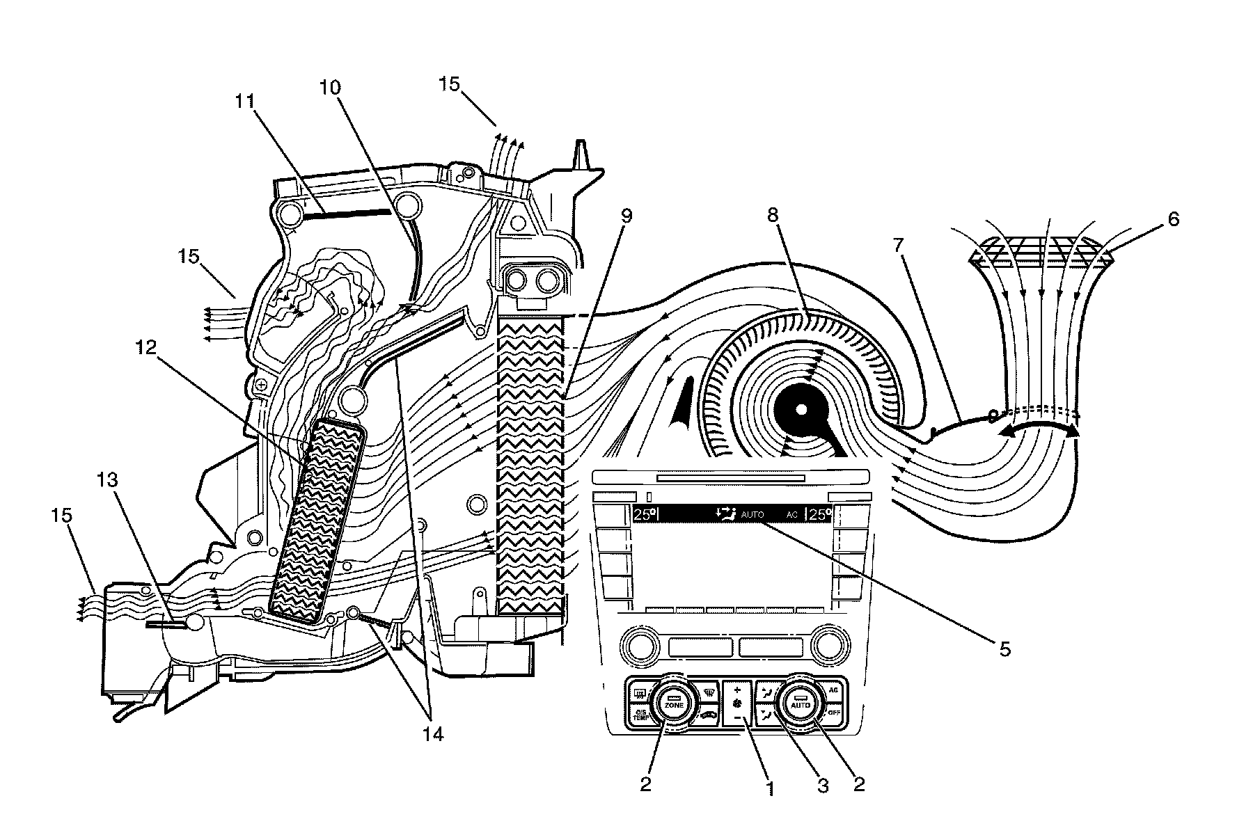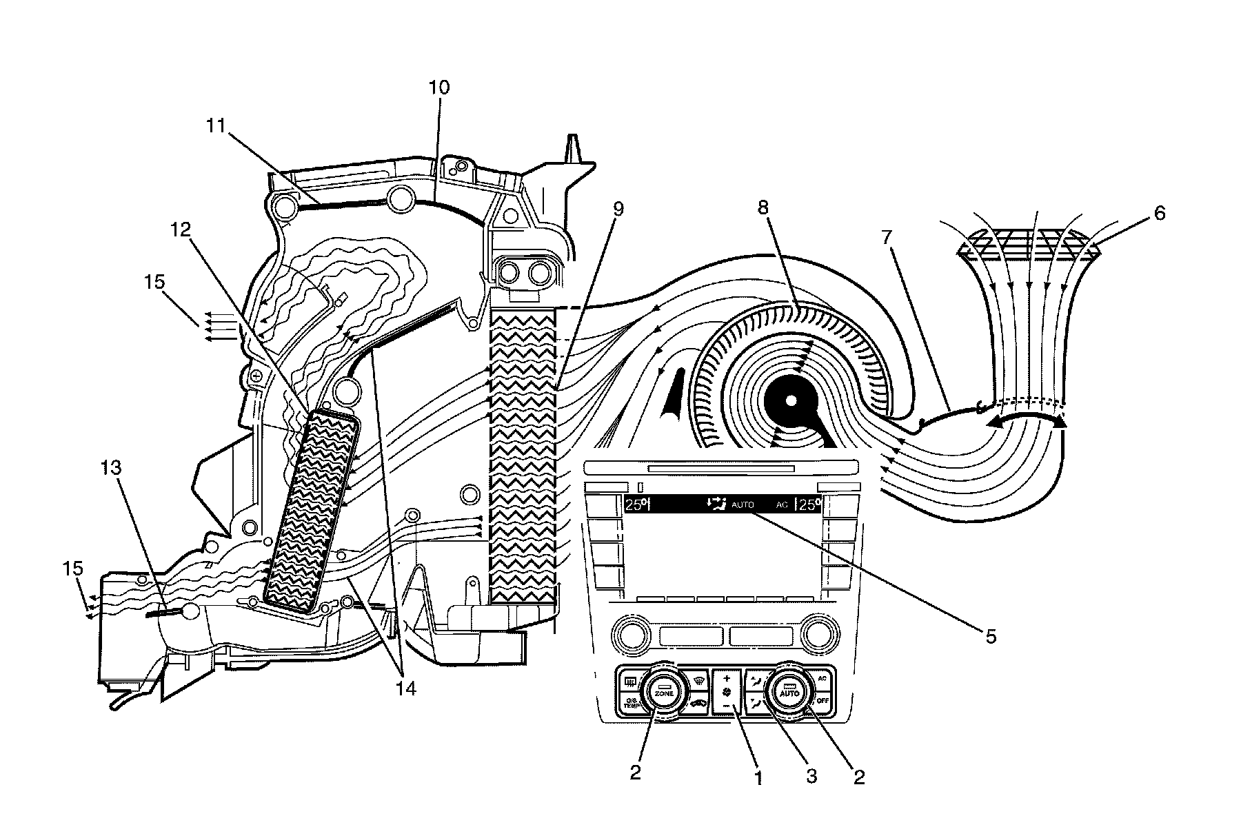 The A/C switch is on (1) or the auto button is pressed. The fan switch is set to any one of twenty speeds (2). The temperature switch is set to the full cold position (3). The mode control switch is set to blend mode (4). The recirculation door (7) is closed allowing outside air (6) to enter and flow into the HVAC module assembly via the plenum chamber inlet. Air is drawn into the HVAC module assembly by the blower motor (8), and is then forced through the cold evaporator fins (9). In full cold mode, the air mix doors (14) are fully closed sealing off the passage through the heater core (12). The air travels through the defrost/floor door (10), which is positioned half way between, defrost and floor modes. The cold air (15) is then directed to both the front windscreen, floor ducts and rear passengers.