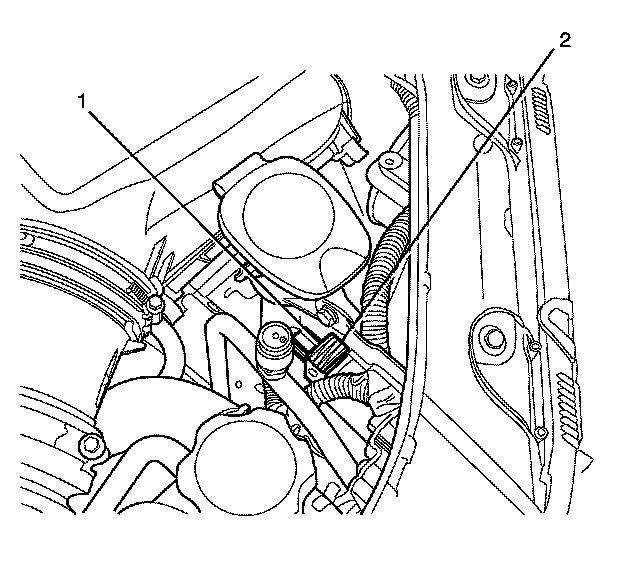 Note: Use a suitable tool to raise the headlamp assembly electrical connector locking tab (2) and pull the headlamp assembly electrical connector (1) rearward.