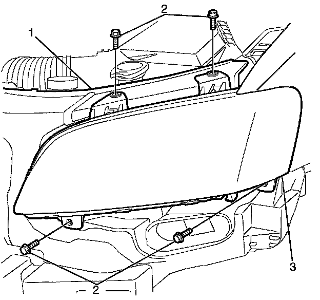 5. Install the headlamp assembly to front end module retaining bolts (2) and tighten to 4 Nm (35 lb in).