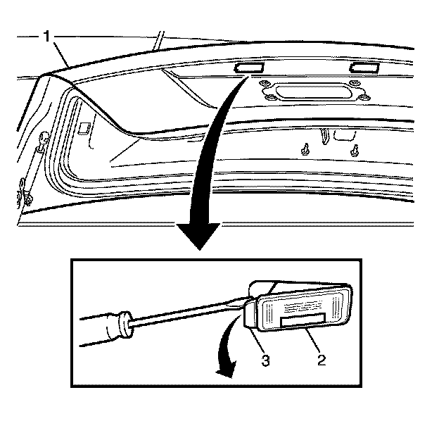Important: Insert a suitable tool under the licence plate lamp housing (2) to release the locking tab (3), then pry the licence plate lamp housing (2) from the rear compartment lid (1) to remove.