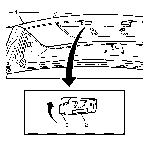 Important: Pivot the license plate lamp assembly (2) into the rear compartment lid (1) cavity and snap into position to install. Listen for an audible click from the locking tab (3) to confirm fitting.