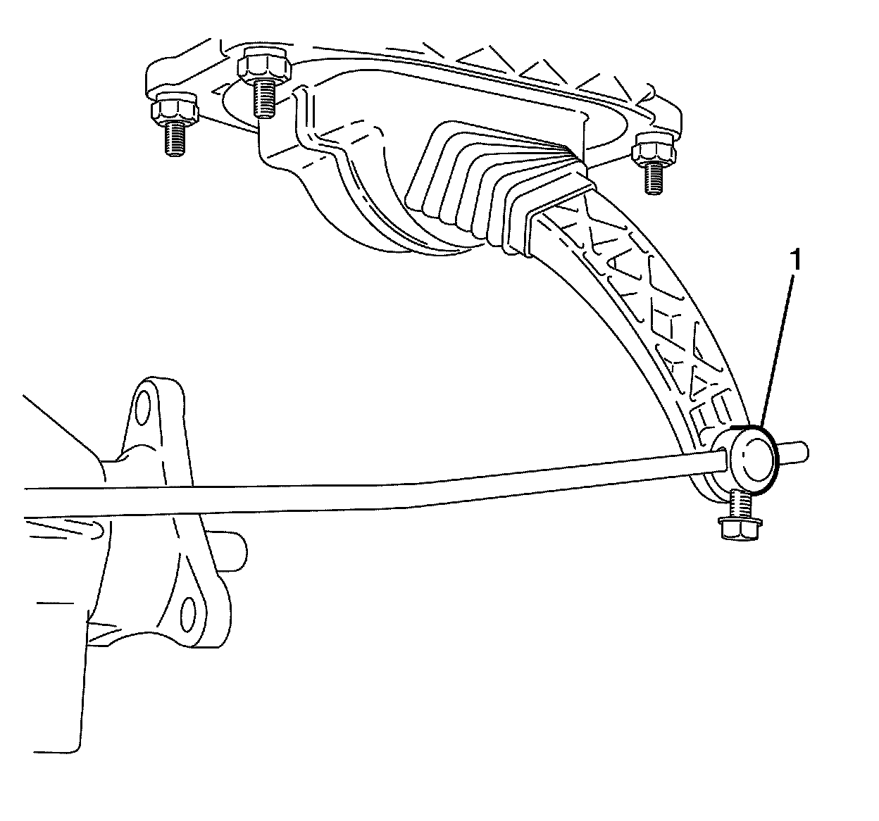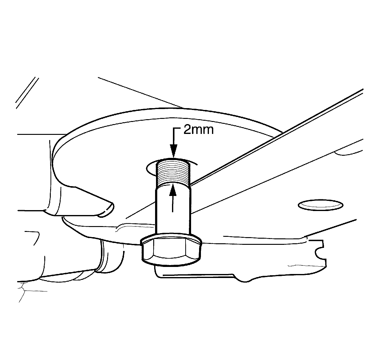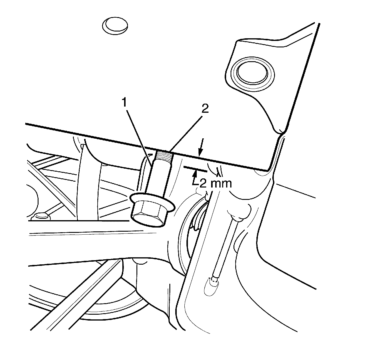 8. Install bolt till stepped shank (1) is 2 mm below sub-frame (2).