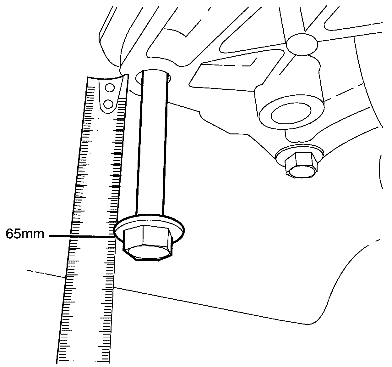 12. Install until 65 mm is measured between bolt heads (1) and transmission mount (2).