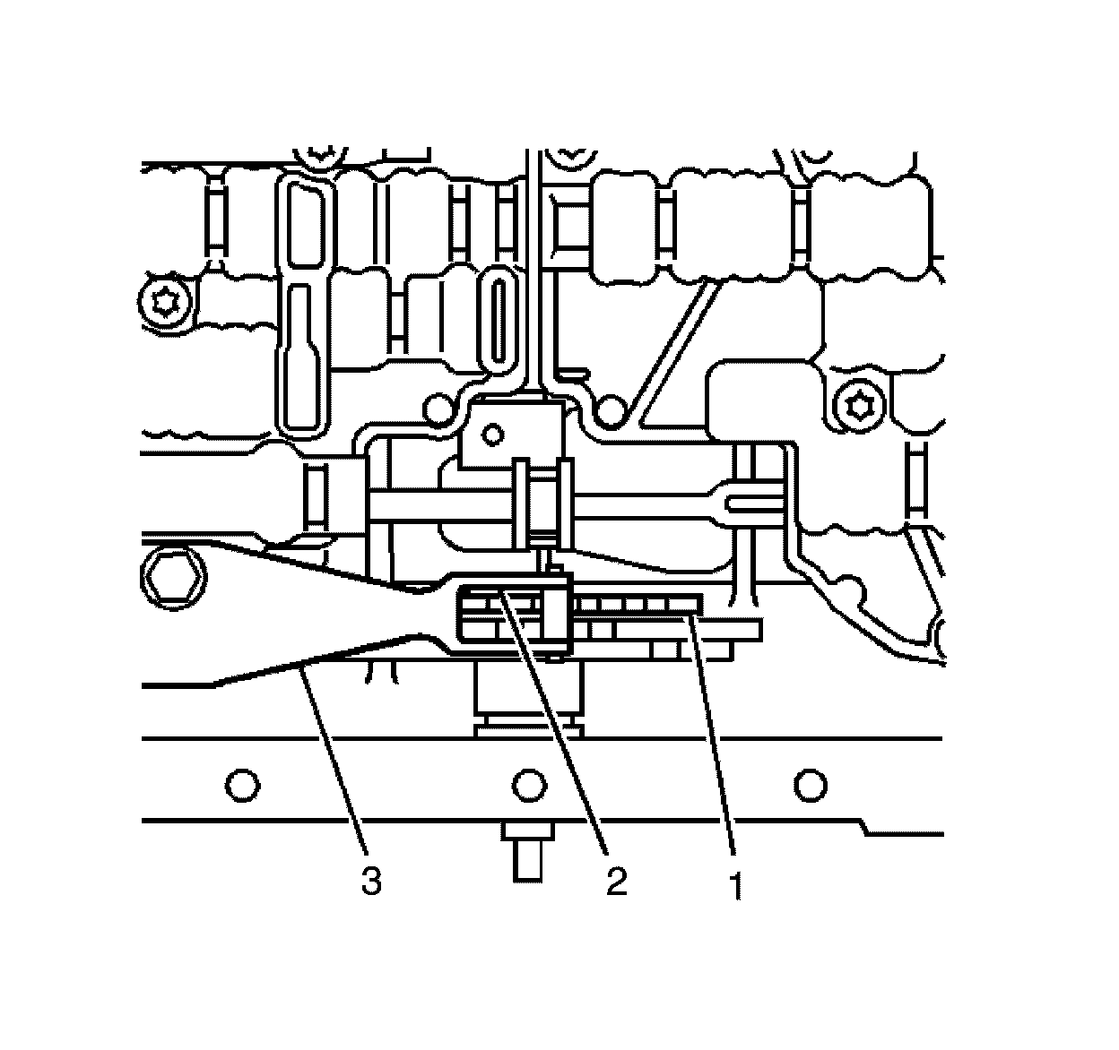 9. Install a 0.8 mm spacer (2) between the manual shaft detent lever (1) and the manual shaft detent spring (3).