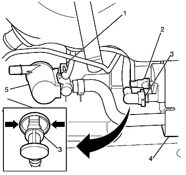 Note: Squeezes the collar of the EVAP canister hose connector (3) to release the connector.