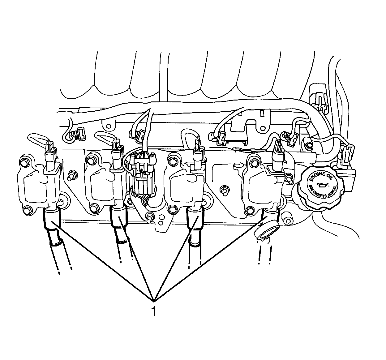 3. Disconnect the spark plug wires (1) from the ignition coils.