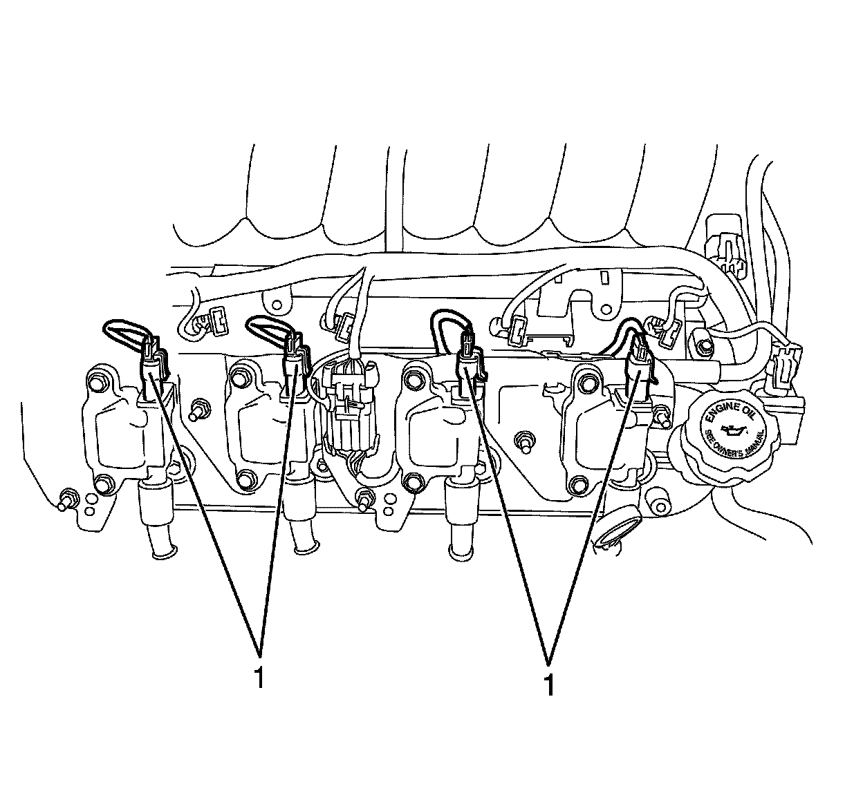3. Connect the ignition coil to ignition coil wiring harness connectors (1).