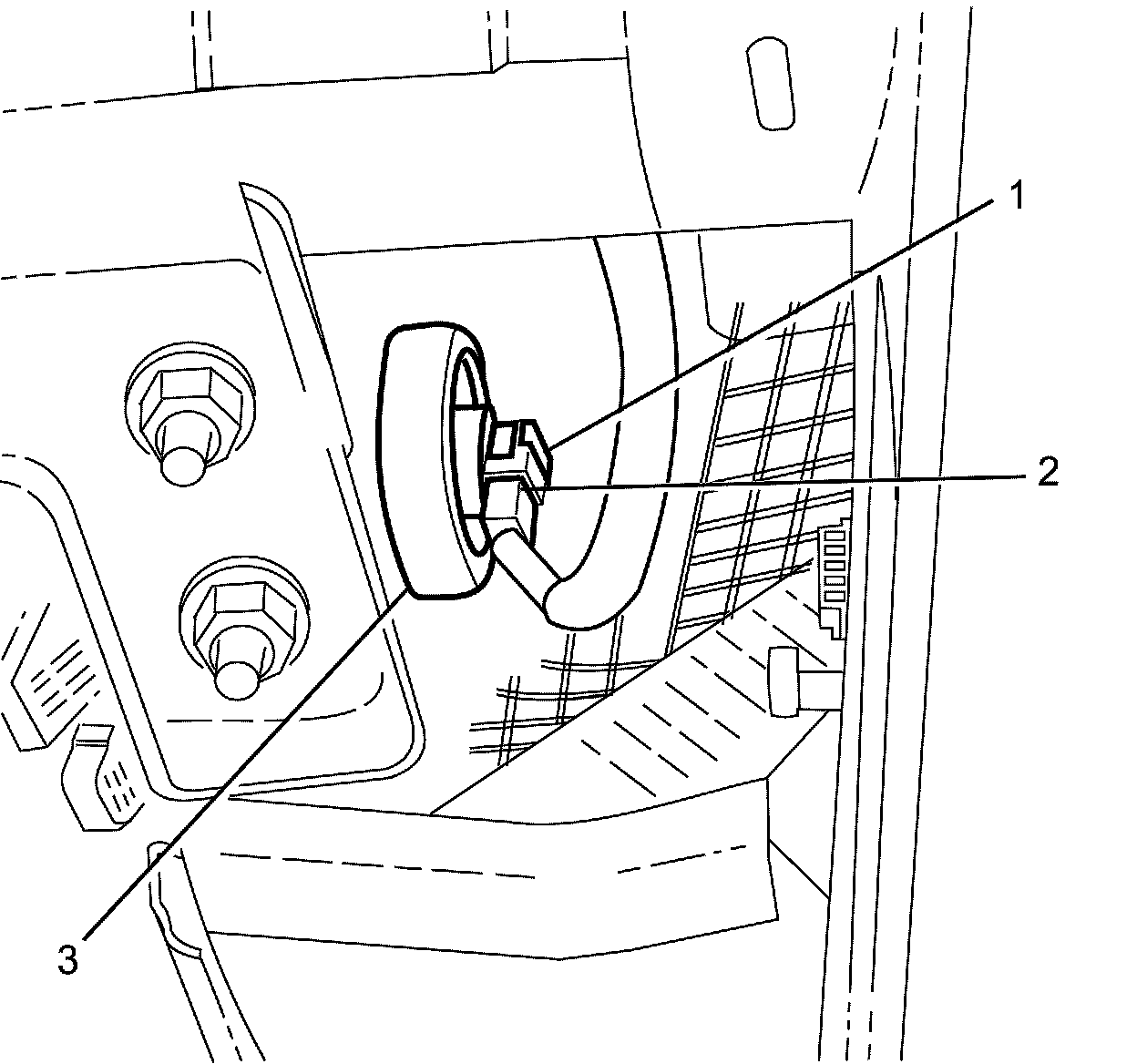 74. Release the electrical connector retaining clip (1) and disconnect the electrical connector (2) from the air bag (3).