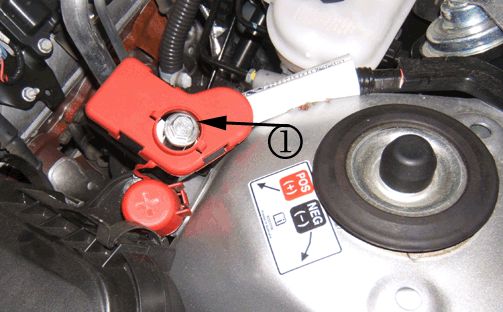 4. Inspect the positive (B+) battery cable jump start bolt (1).