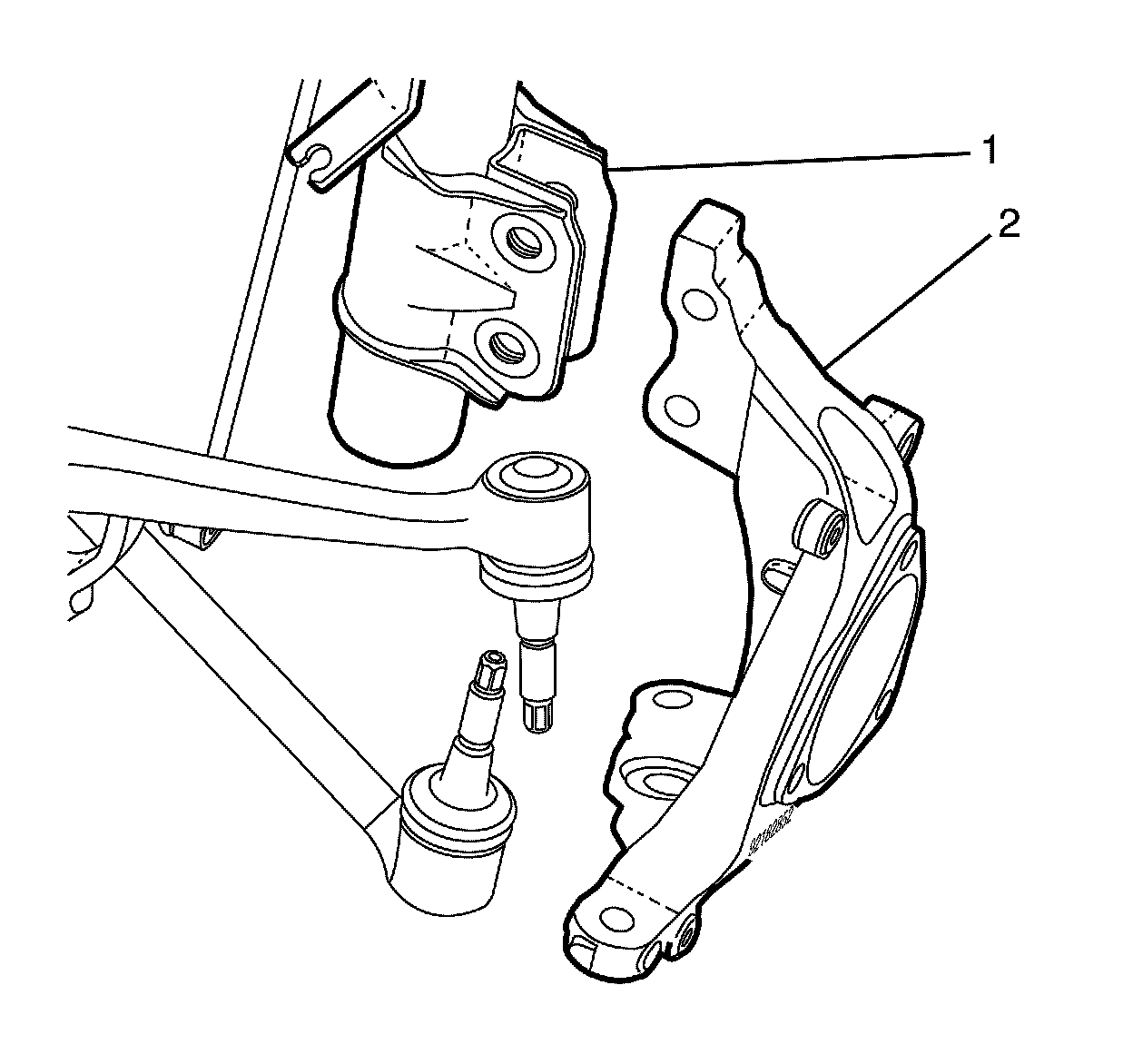 3. Install the steering knuckle (1) to the strut assembly (2).