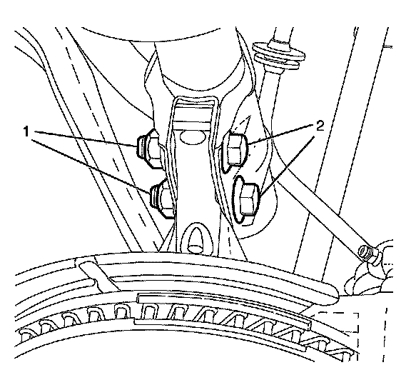 16. Tighten the strut assembly to steering knuckle retaining bolts (2) and nuts (1).