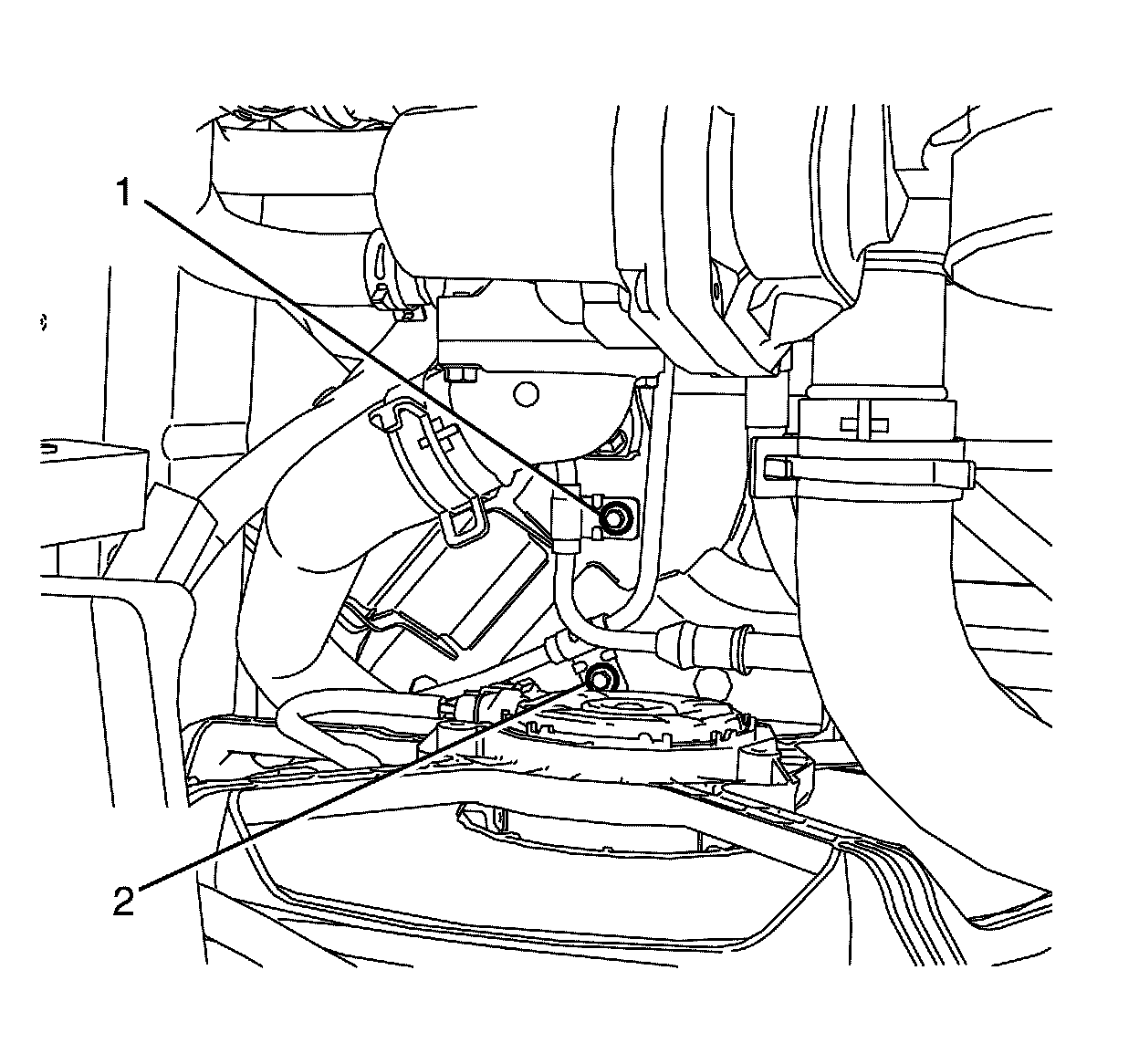 11. Remove the power steering gear inlet pipe bracket to subframe retaining bolt (2).