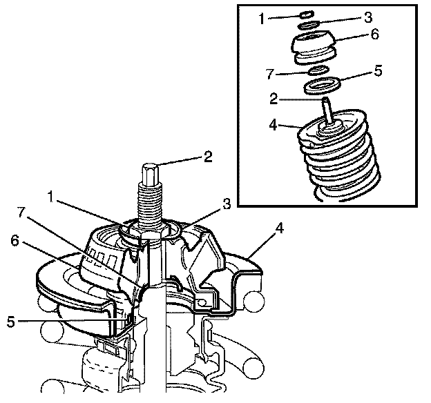 Note: The front strut assembly support bearing (5) is a sealed part and is replaced as an assembly.