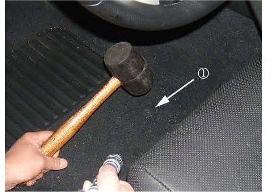 7. In order to gain access to the underside of the carpet, remove the two forward carpet retainers. The first retainer (1) is located on the carpet insulator, the second (2) is located underneath.