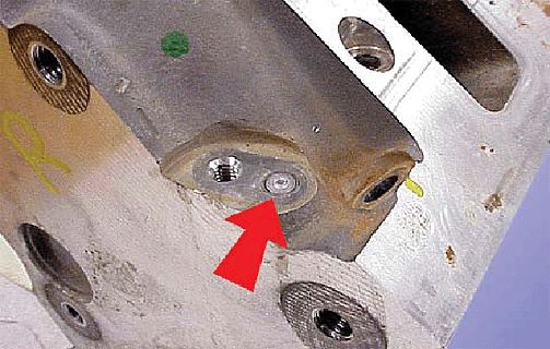 In the Gen IV V8 engine, the coolant air bleed passage at the top rear of the cylinder heads was previously sealed with a bolt-on aluminum cover block. As a running change, the coolant air bleed passage opening was revised. It is now sealed with a rivet plug, which is essentially a solid soft aluminum "pop" rivet.
