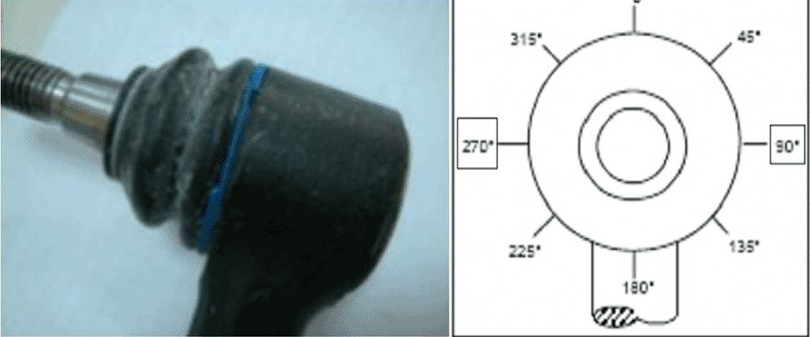 12. Inspect the big clamp ring. Make sure that the position of the coil end is at 90 or 270 degrees to the length of the control arm. If the clamp ring is incorrectly indexed, it may interfere with the movement of the ball joint.