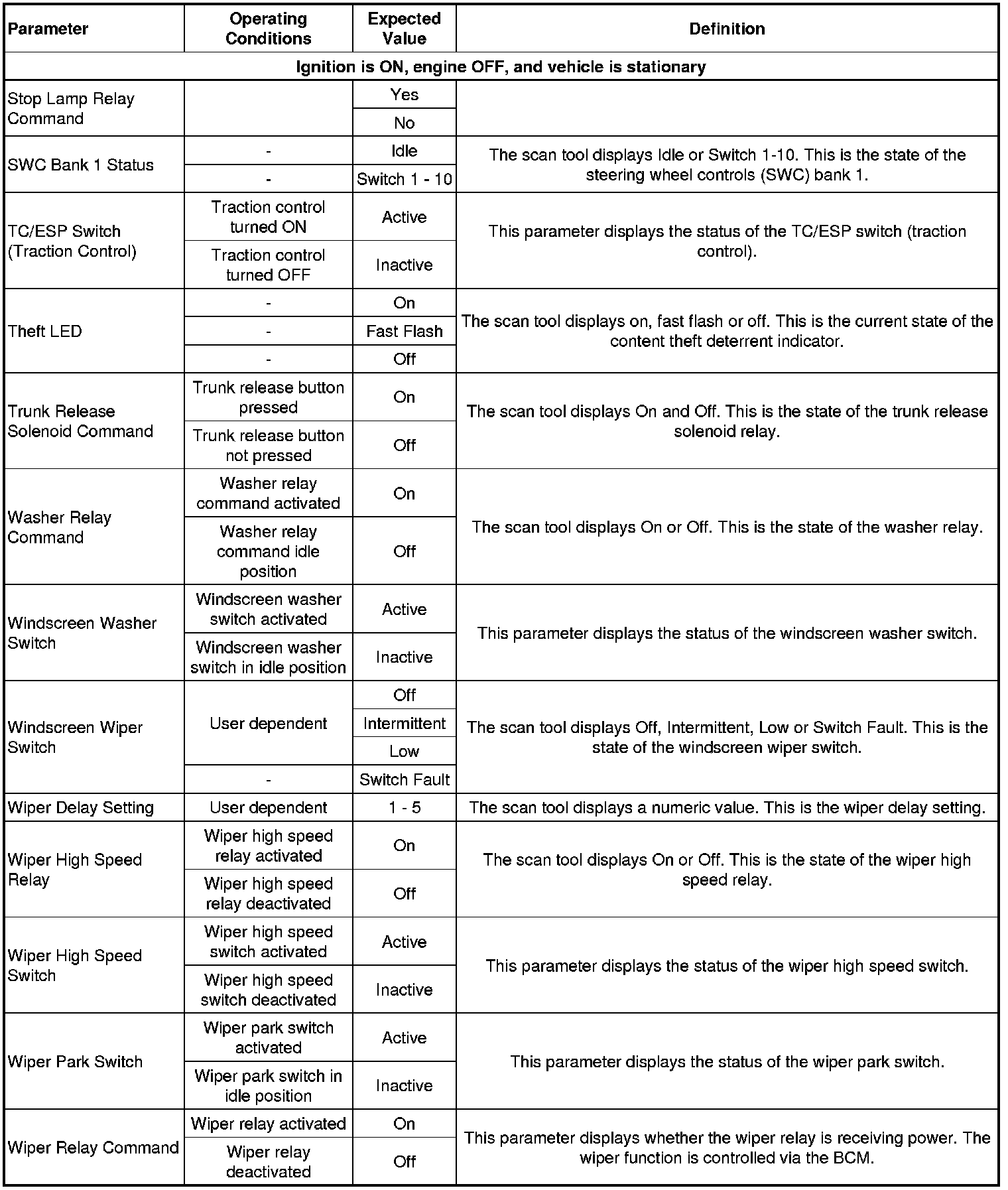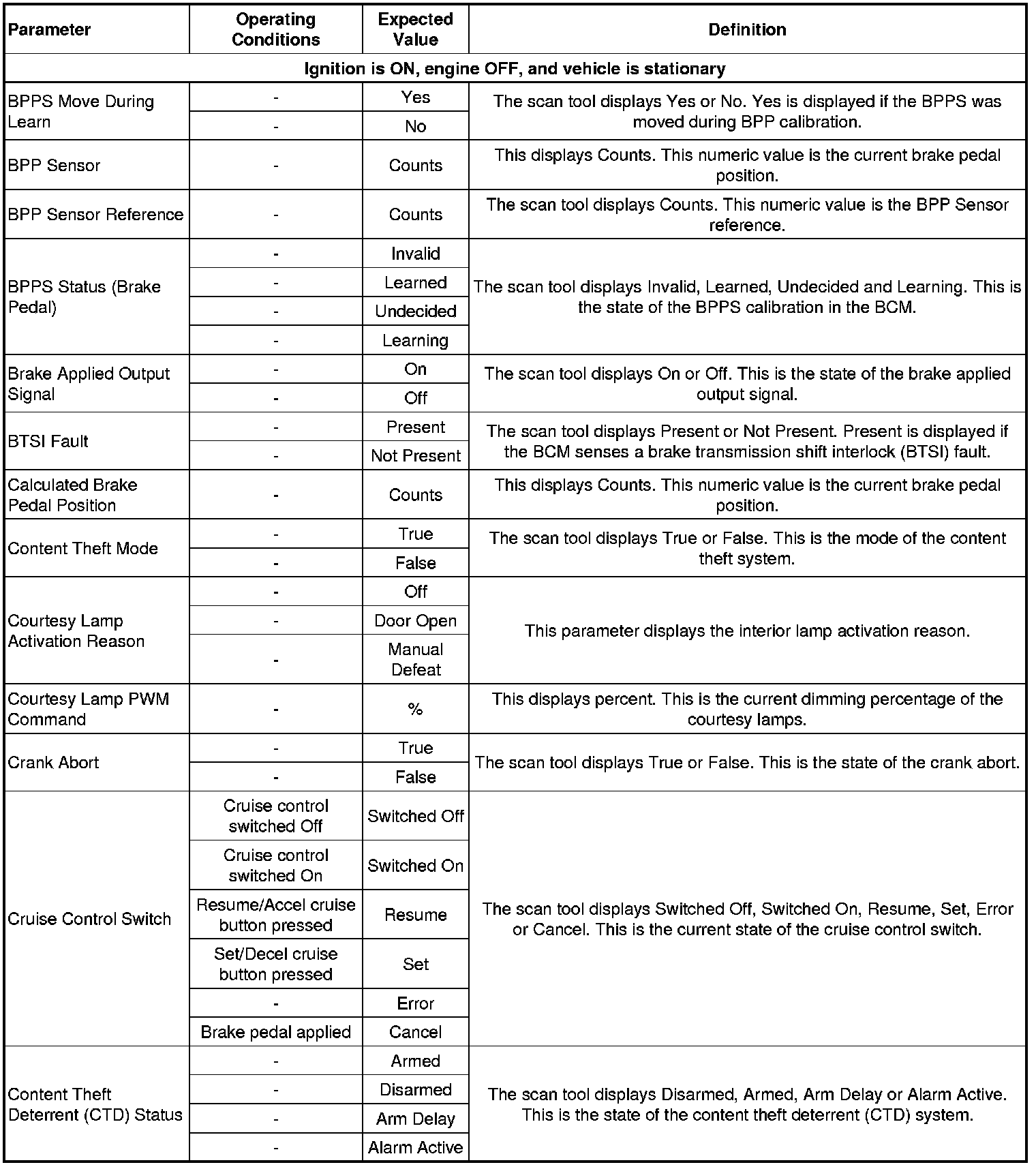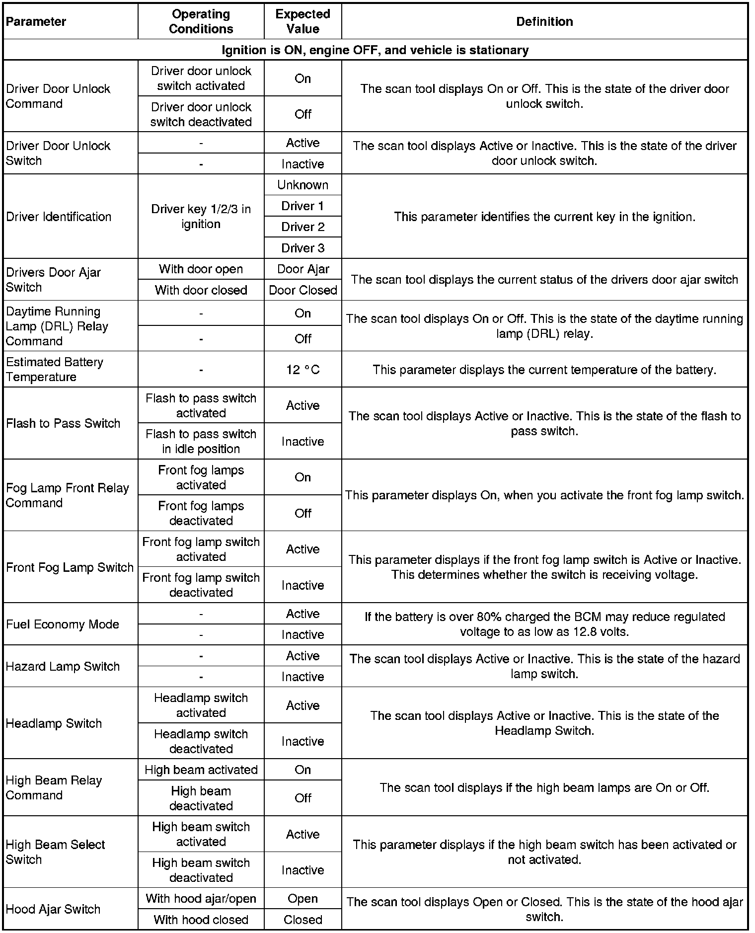 Body Control Module Scan Tool Data Parameters