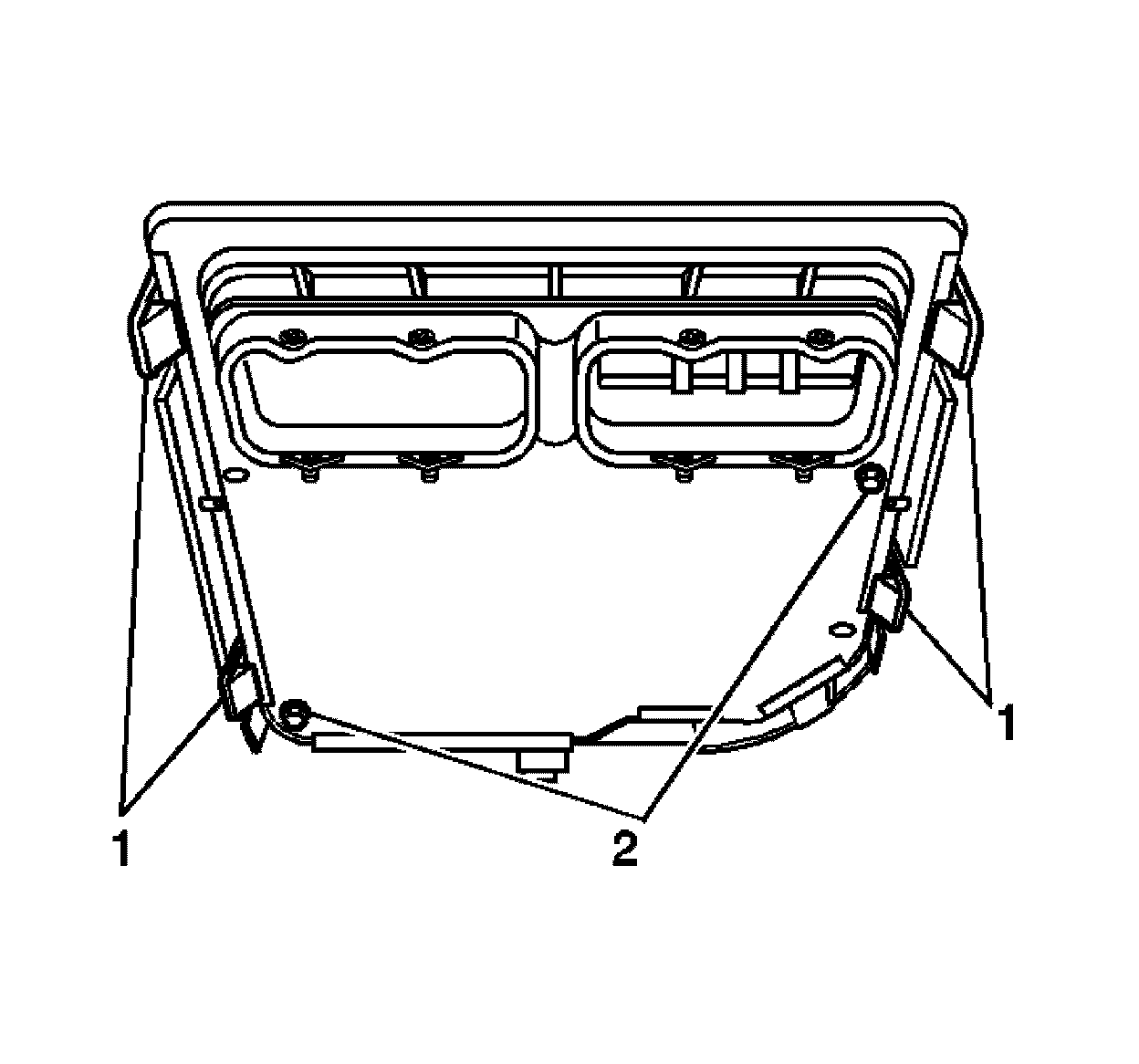 1. Align the transmission control module with the locating pins (2) on the module mounting bracket.