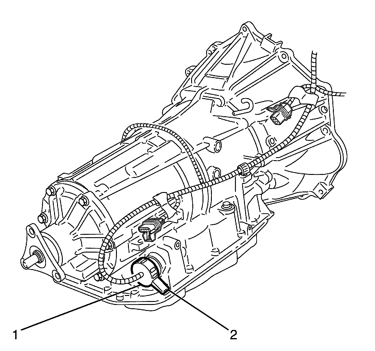11. Disconnect the transmission wiring harness connector (1) from the transmission by rotating the locking latch (2) counter-clockwise.