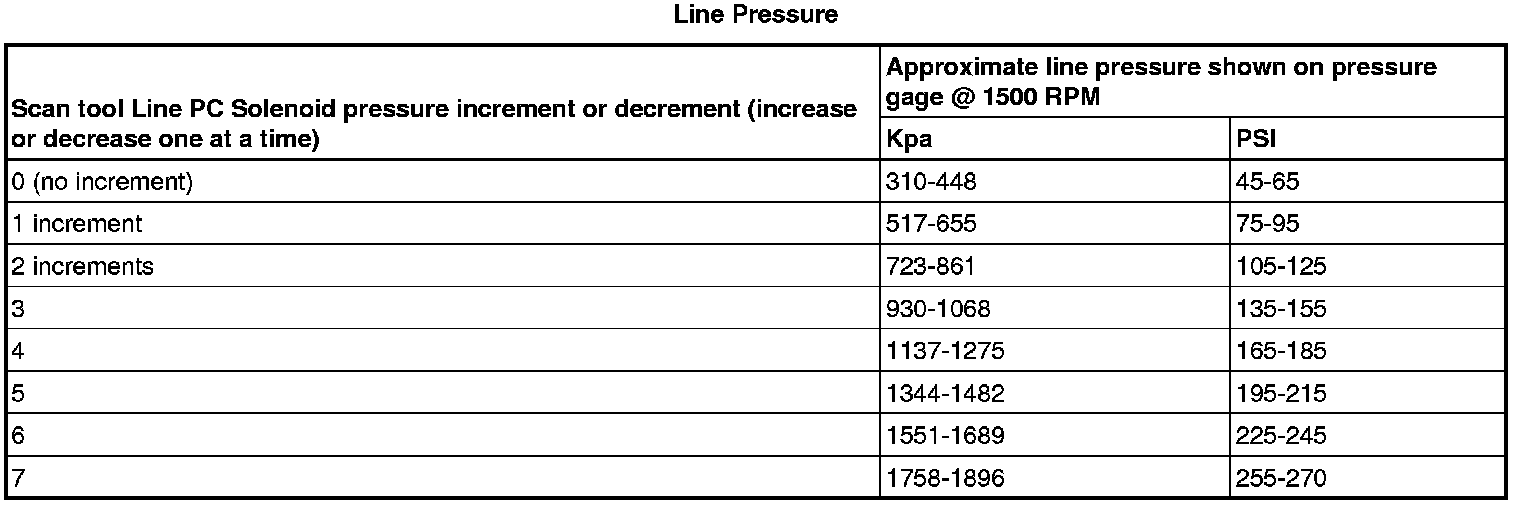 The scan tool commands line pressures in increments of approximately 200 Kpa (30 psi). However, these pressure values are not displayed on the scan tool screen.
