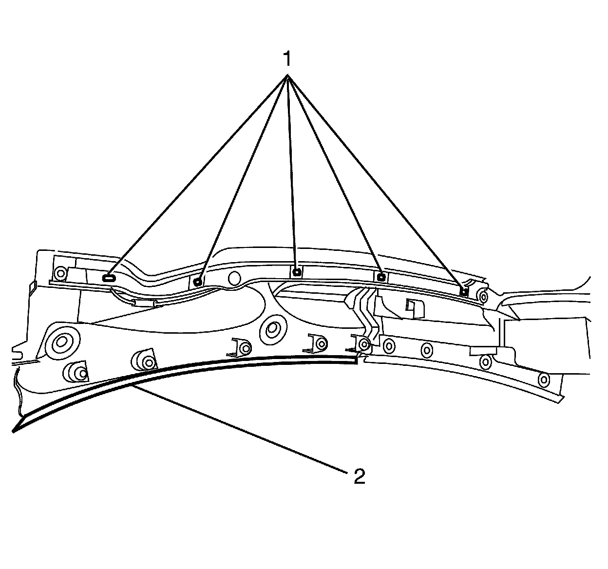 3. Install the air inlet grille brace (2) to the air inlet grille retaining torx screws (1) and tighten to 2.0 Nm (18 lb in).