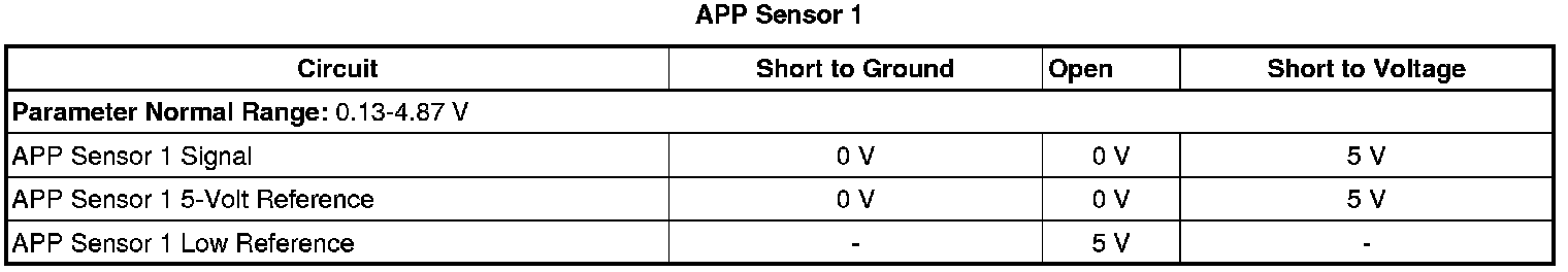 • If greater than 0.1 volts, test the APP sensor 1 and 2 signal circuits terminals 3 and 6 for a short to voltage. If the circuit tests normal, replace the ECM.