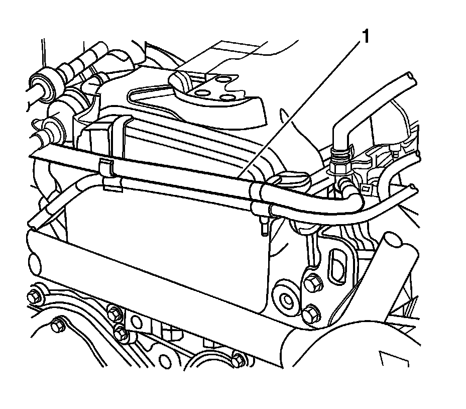5. Use Hose Pinch-Off pliers or equivalent clamp the rubber portion of the turbocharger coolant feed hose (1) near the front left of the engine. Be sure the hose is clamped tight enough not to let air or coolant pass through.