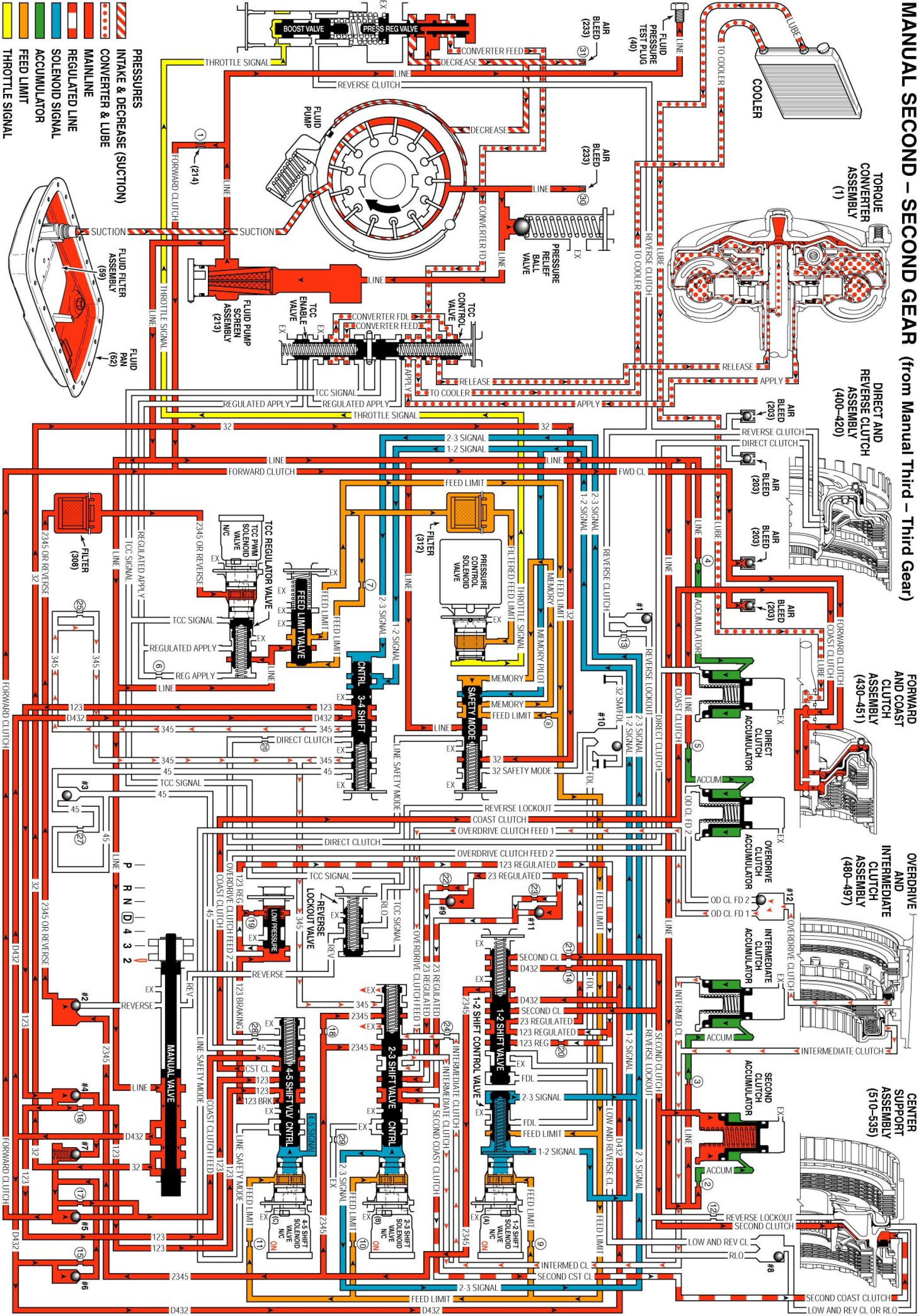 Manual Second - Second Gear may be selected at any time while the vehicle is being operated in a forward gear range. However, TCM control prevents the transmission from upshifting above Second gear. When the gear selector lever is moved to Manual Second from Manual Third - Third Gear, the manual valve also moves. Changes to the hydraulic and electrical systems are as follows: