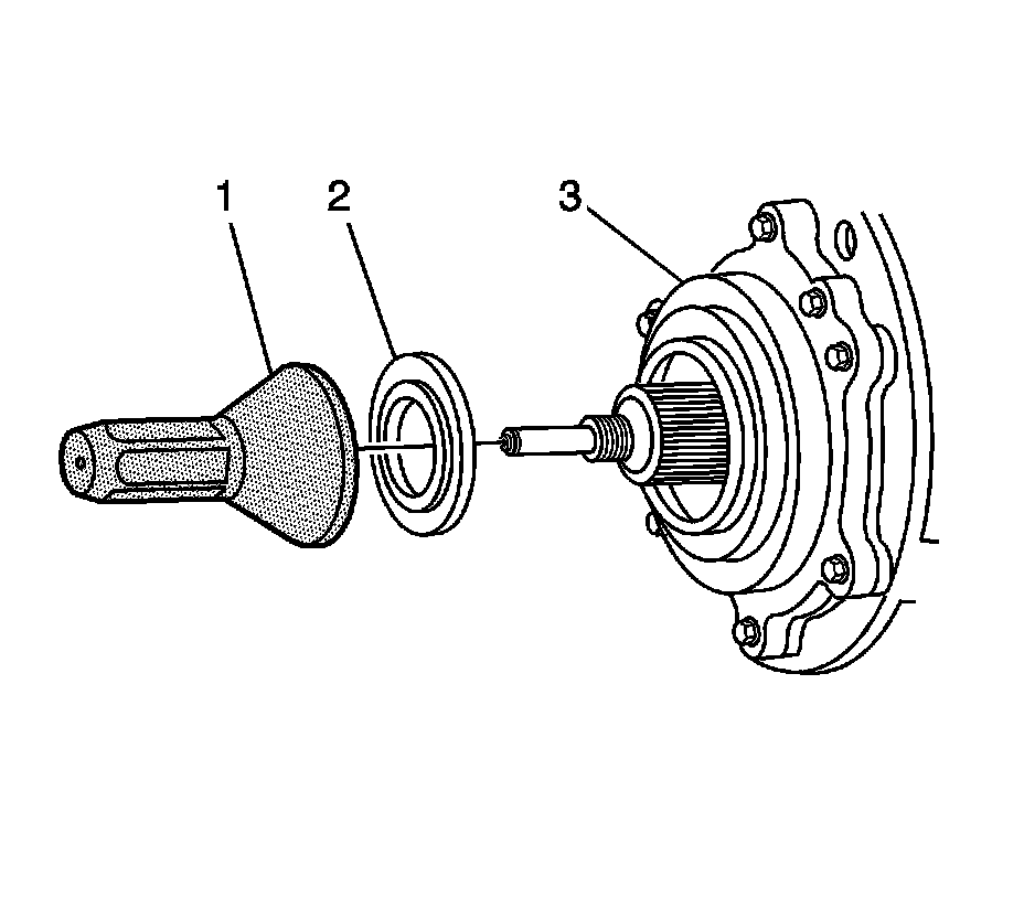 3. Using the J 42851 (1) , install the drive pinion seal (2) in the differential (3).